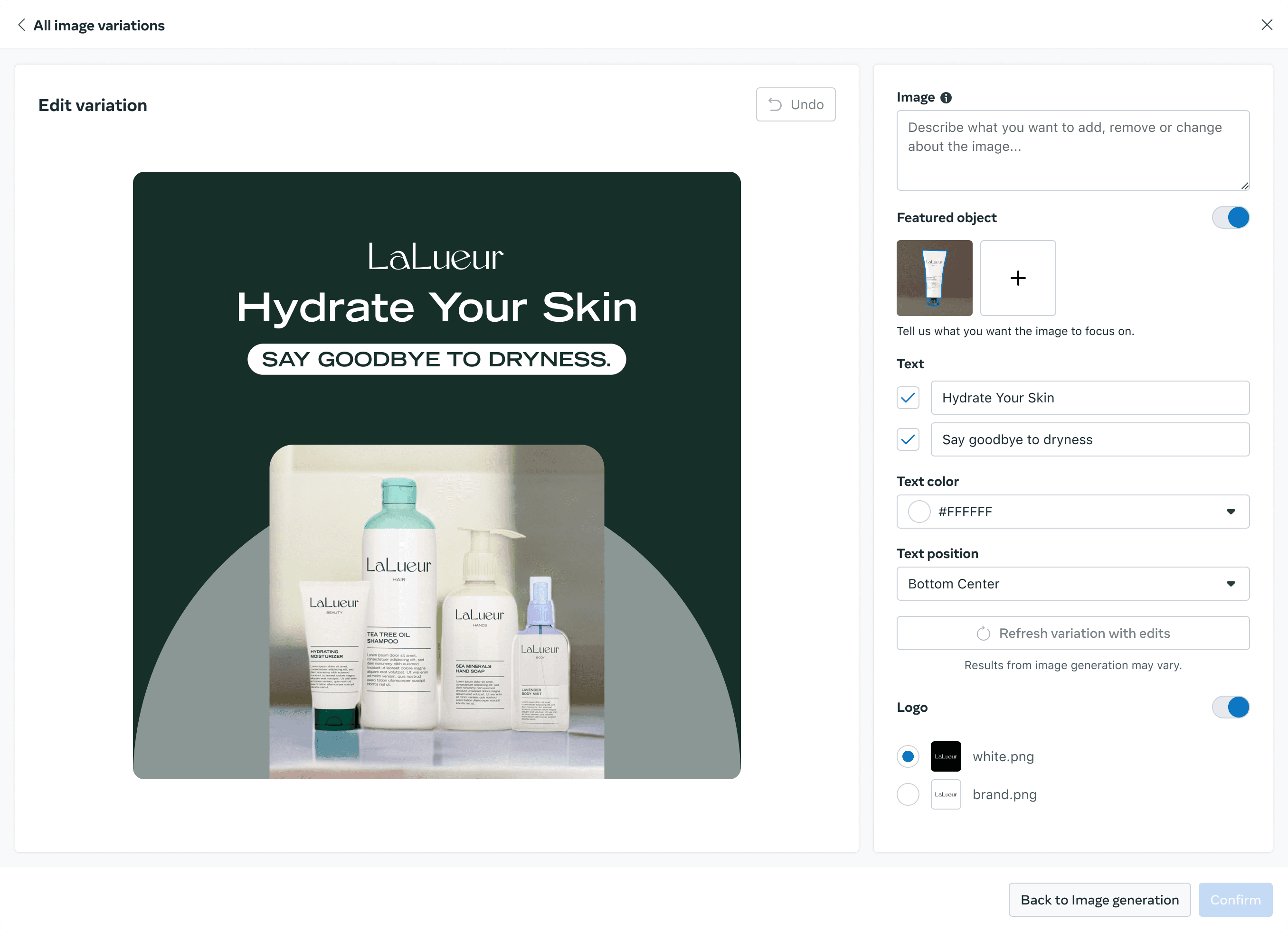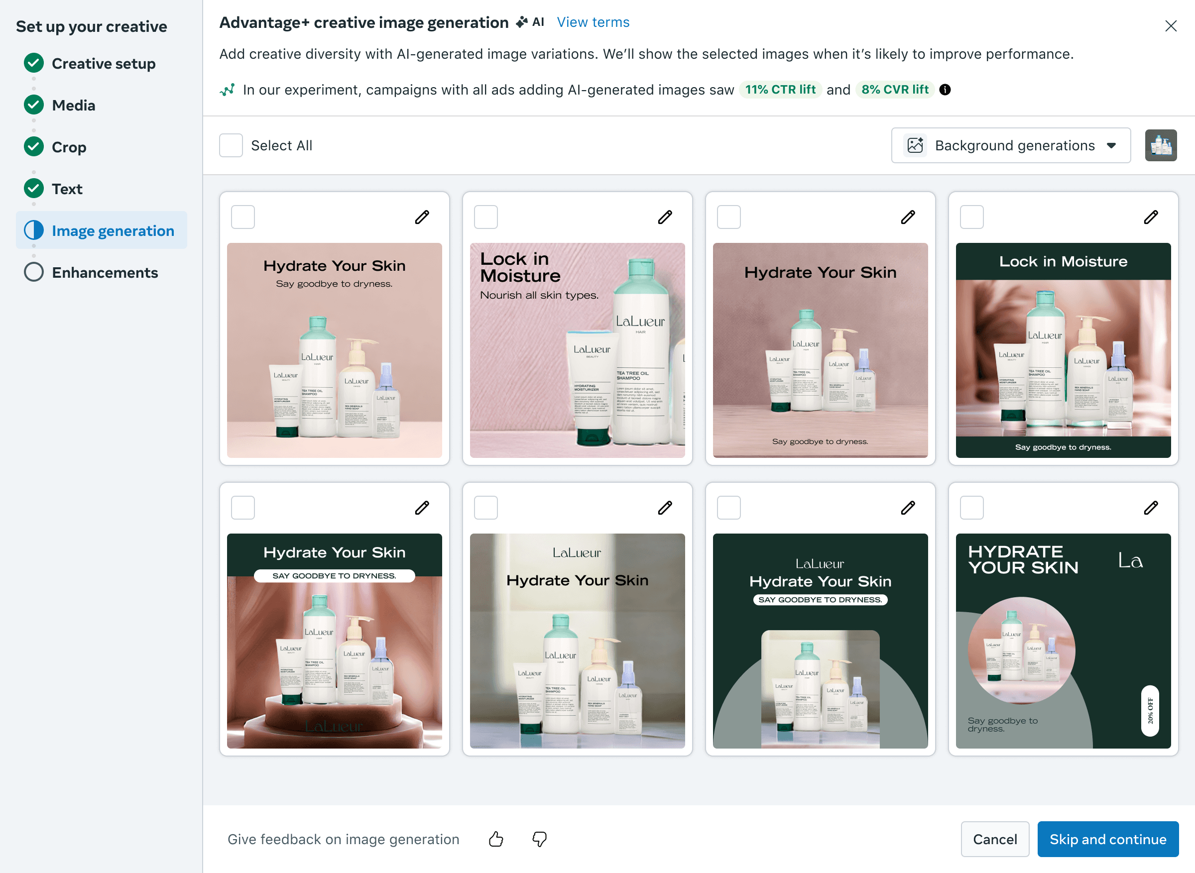 I led the redesign of an AI image generation product built for social media advertisers. The improvements our team made resulted in a 35% increase in published campaigns that included at least one AI generated image variation.